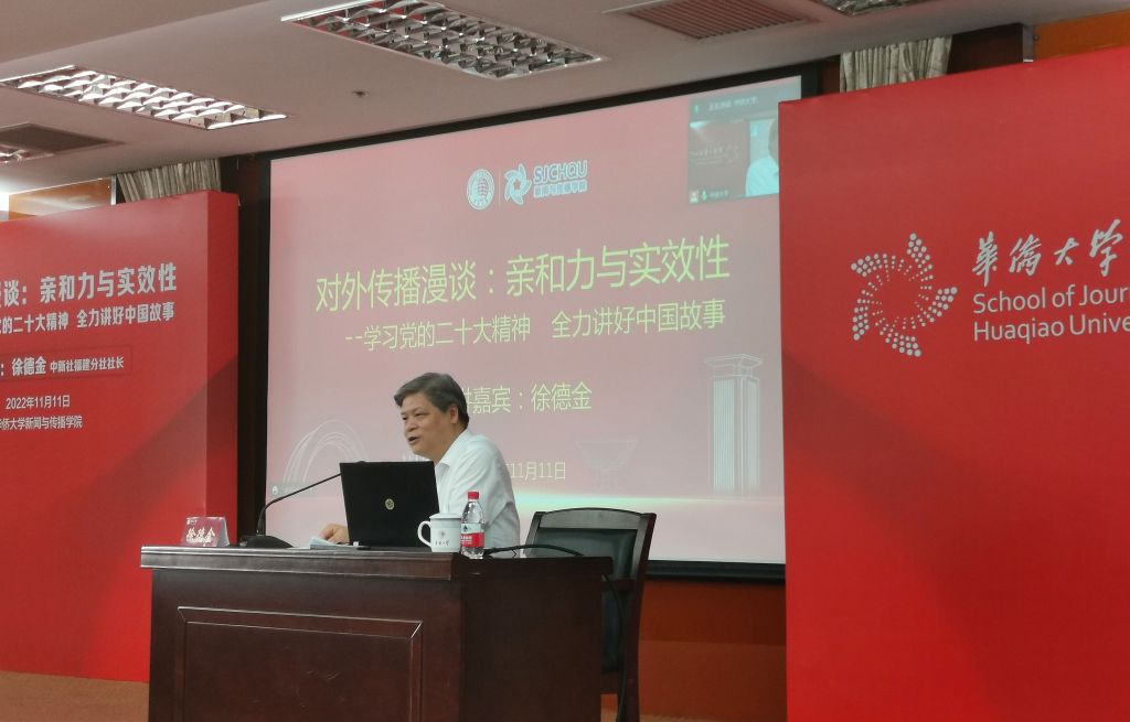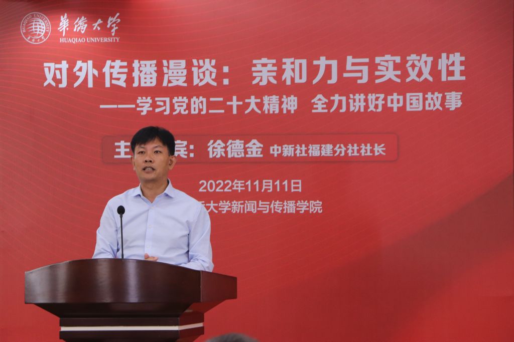 深入学习党的二十大精神,11月11日上午,新闻与传播学院邀请中国新闻社福建分社社长、高级记者徐德金,在图书馆学术报告厅通过线上线下双会场的方式为全院师生做了名为“对外传播漫谈:亲和力与实效性——学习党的二十大精神全力讲好中国故事”的专题讲座。